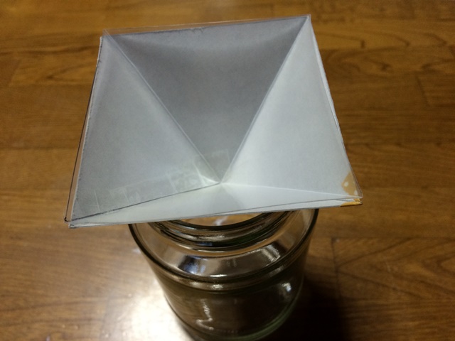 初めに作った型はこれから同じ形を簡単に作れるように残しておき、もう1つ作った工作用紙でピラミッド型を作ります。